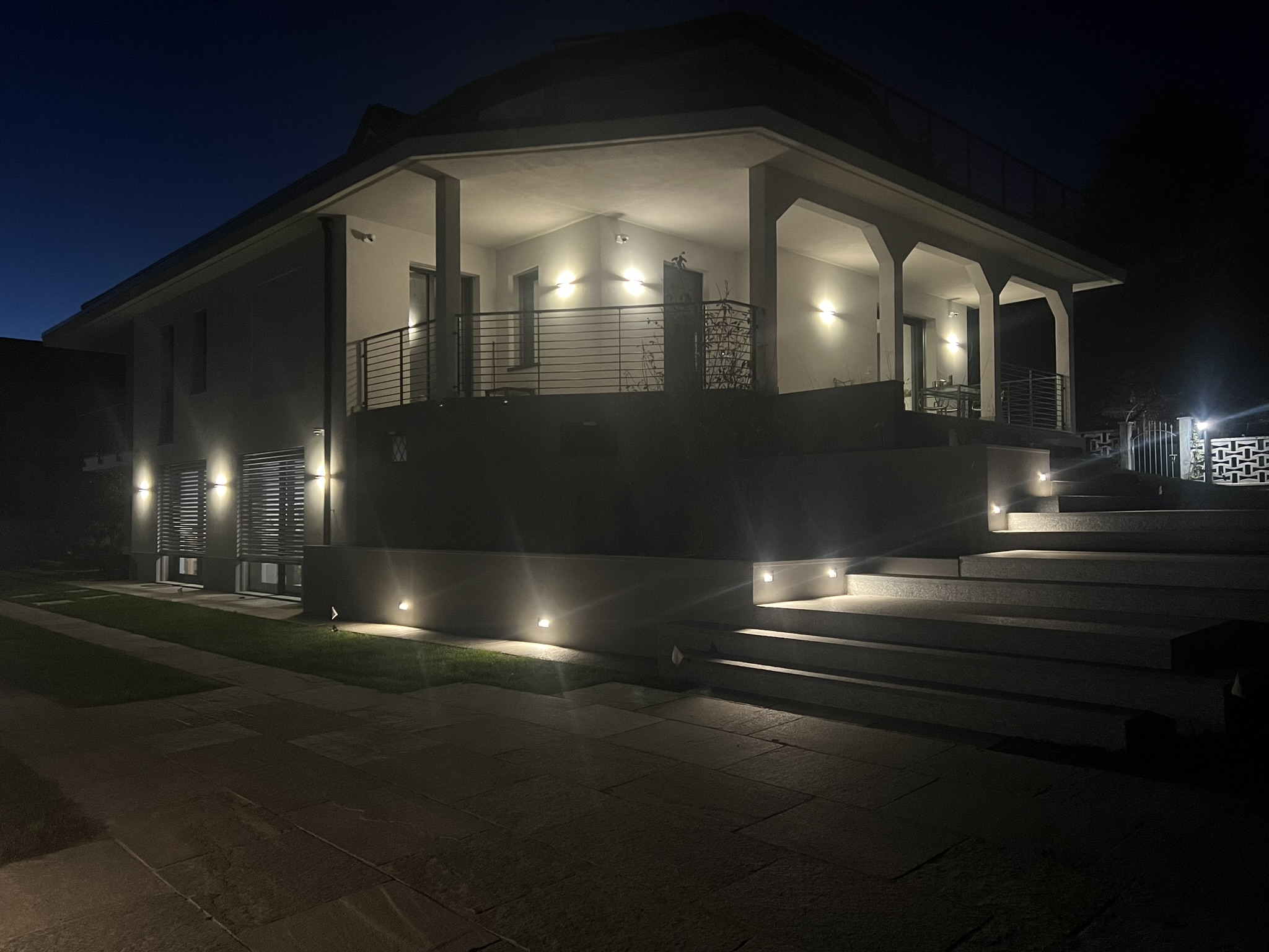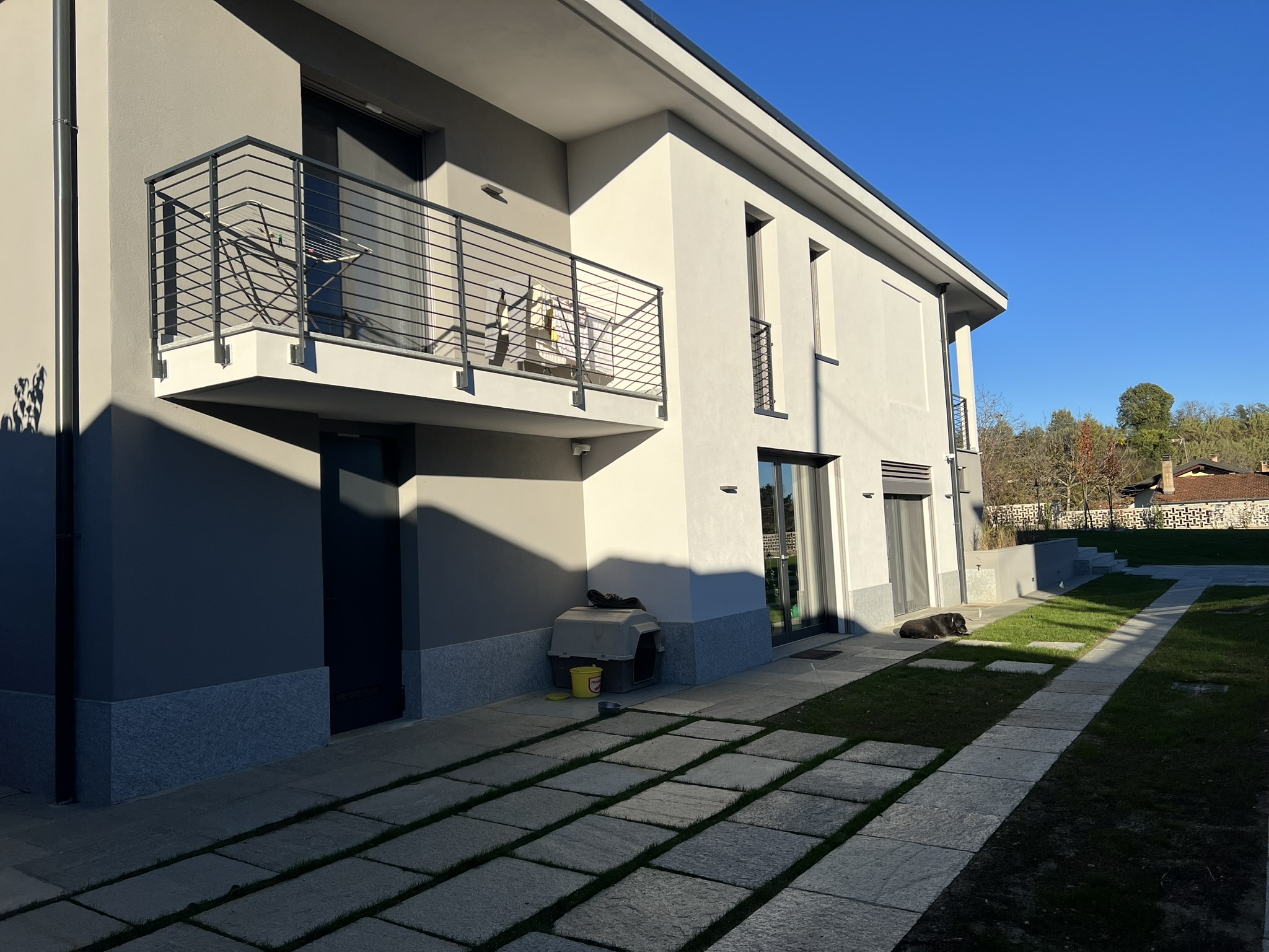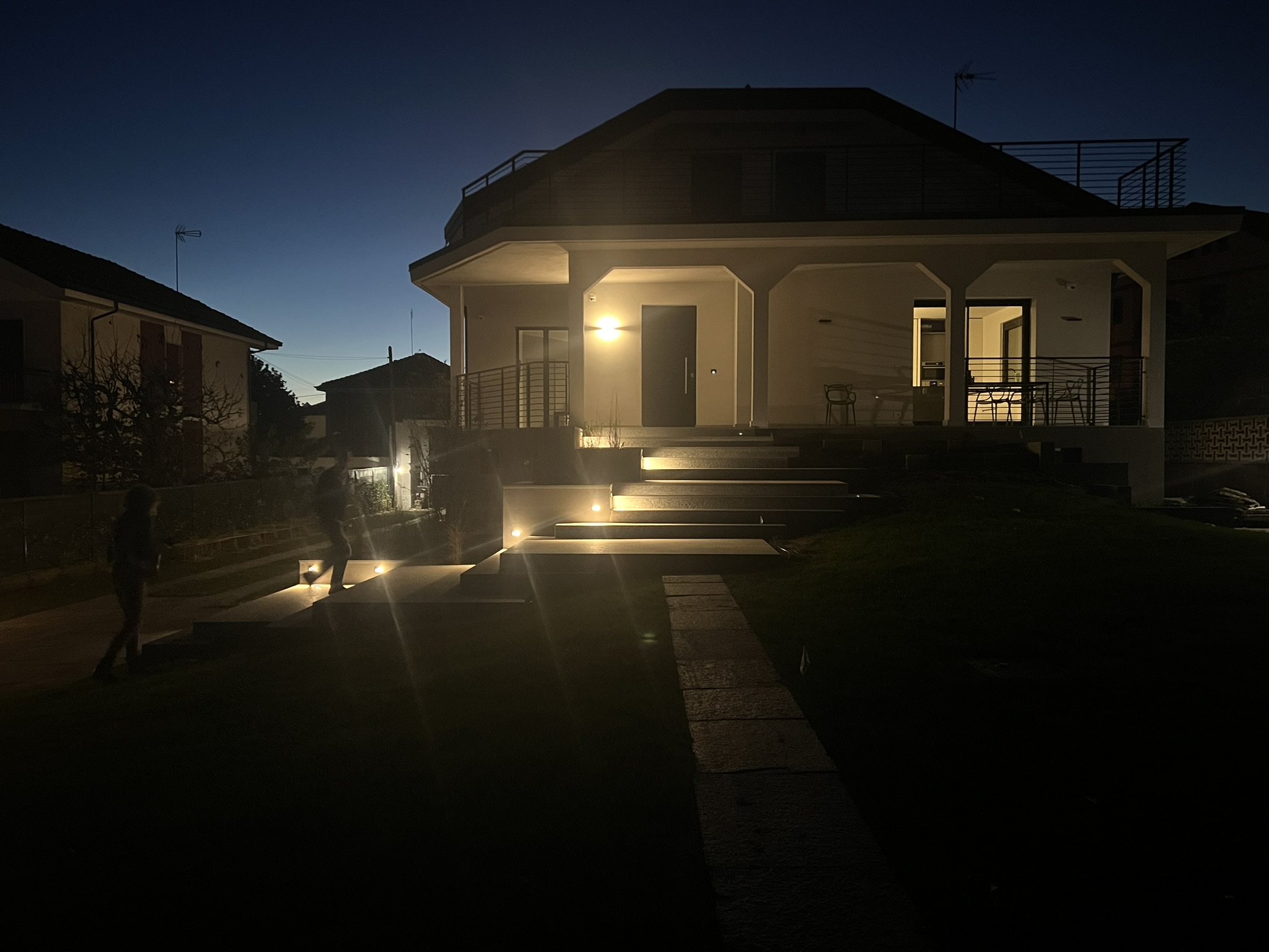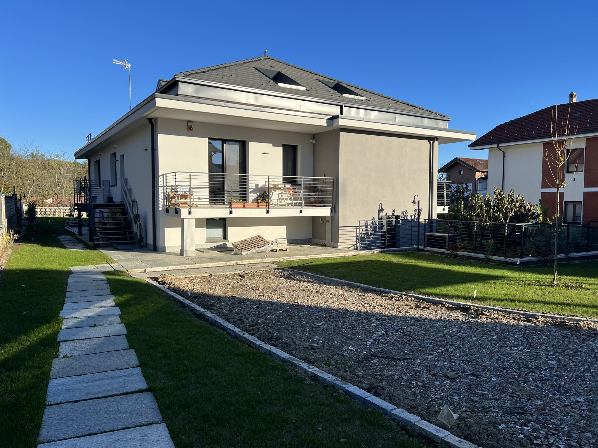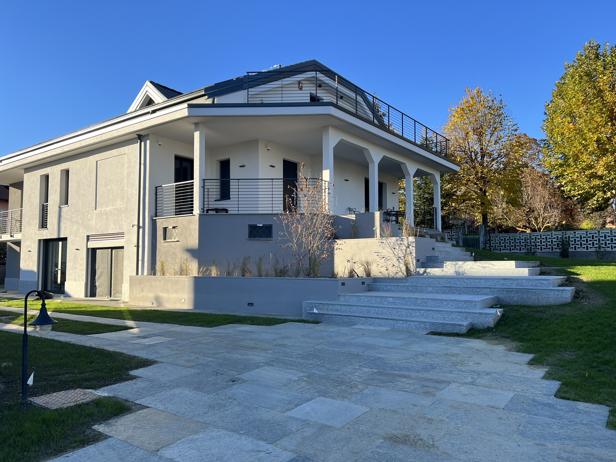 Sono state inoltre realizzate nuove scale esterne (una dotata di piattaforma elevatrice per l’accessibilità), terrazzini in copertura, e un rinnovamento estetico dell’edificio con nuove finiture, parapetti in metallo e pavimentazioni esterne coordinate. Il progetto si è concluso con la riqualificazione del giardino, studiato nel dettaglio per valorizzare l’intero contesto residenziale.