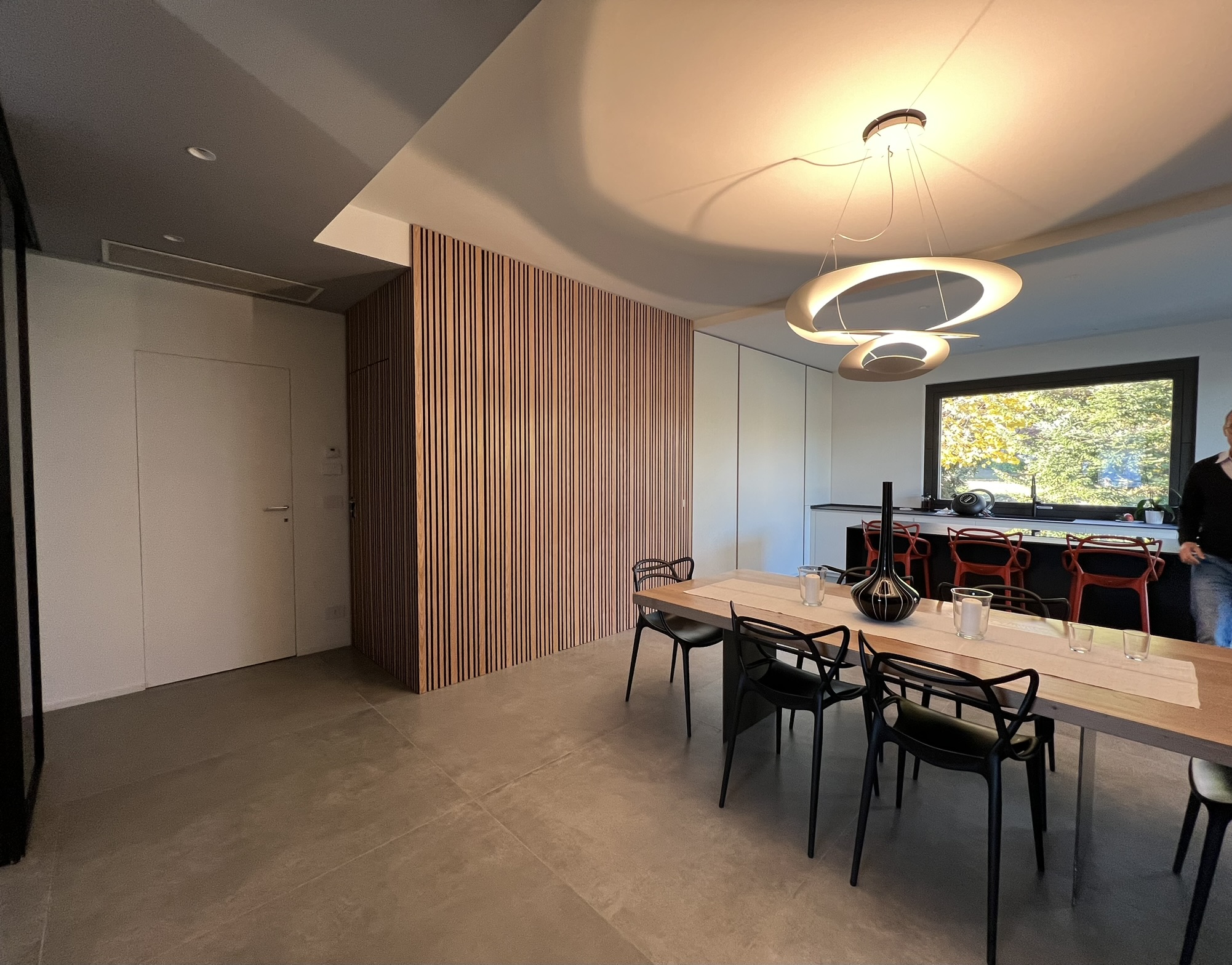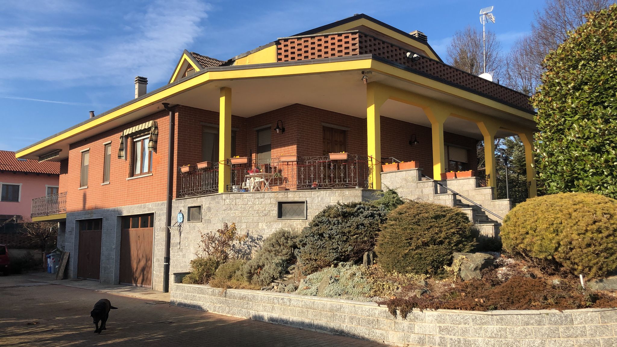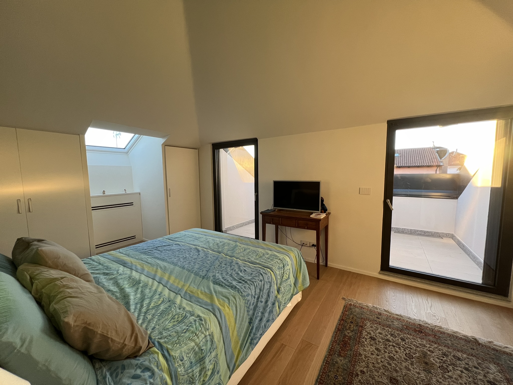 Parallelamente, la ristrutturazione esterna ha previsto una riqualificazione energetica completa, realizzata con Superbonus 110%, che ha consentito il passaggio dalla classe energetica F alla A4. Gli interventi hanno incluso cappotto termico, isolamento della copertura, nuovi serramenti in alluminio, impianto fotovoltaico, pompa di calore con pannelli radianti e sistema di raffrescamento canalizzato, oltre all’installazione di colonnine di ricarica elettrica.